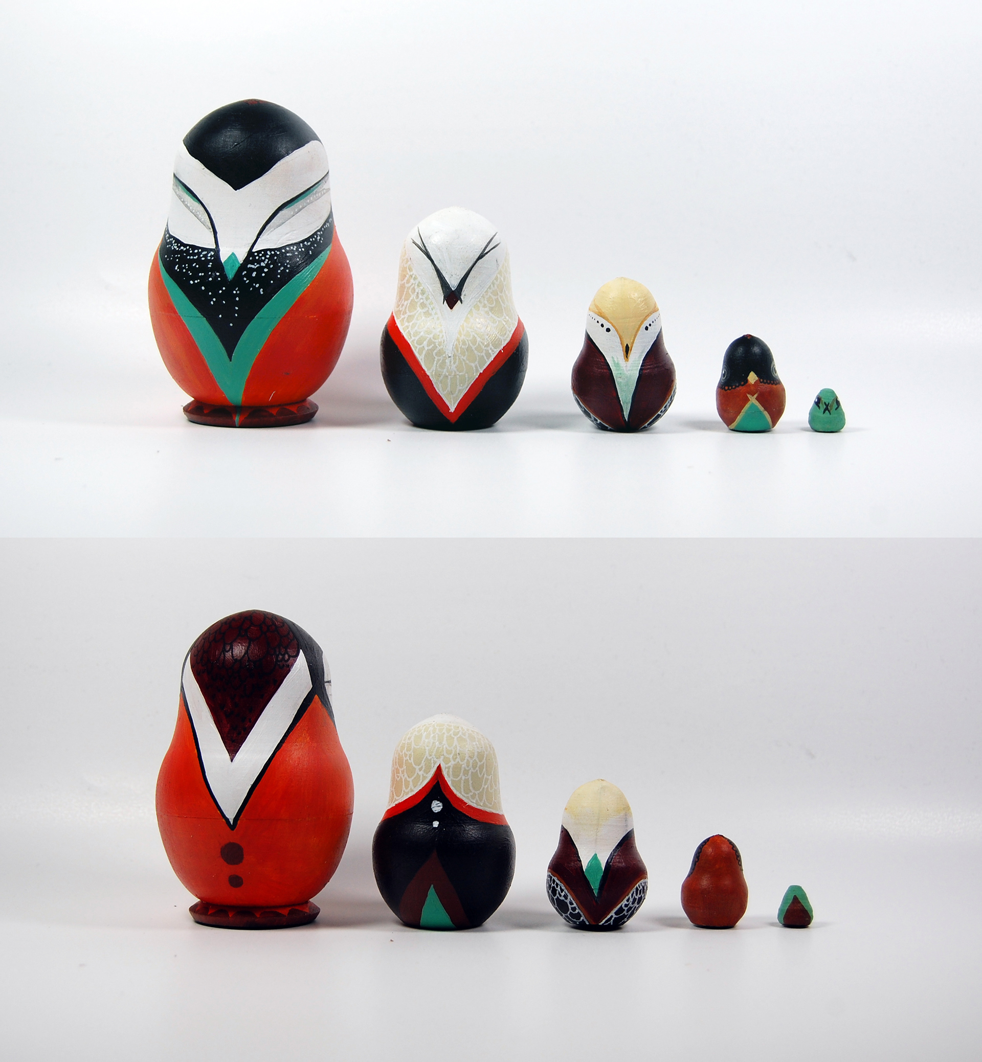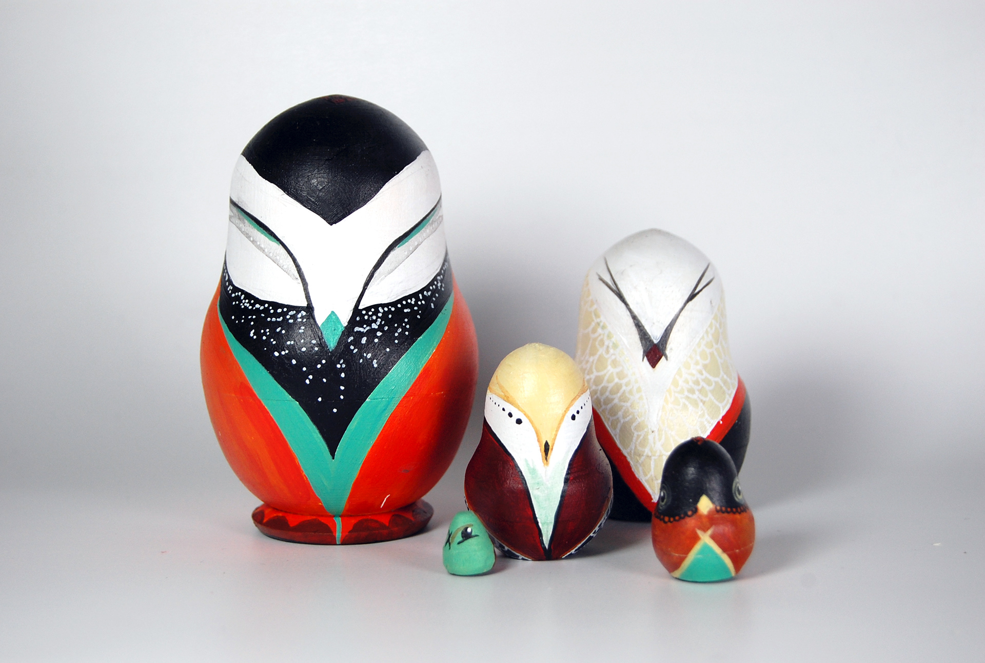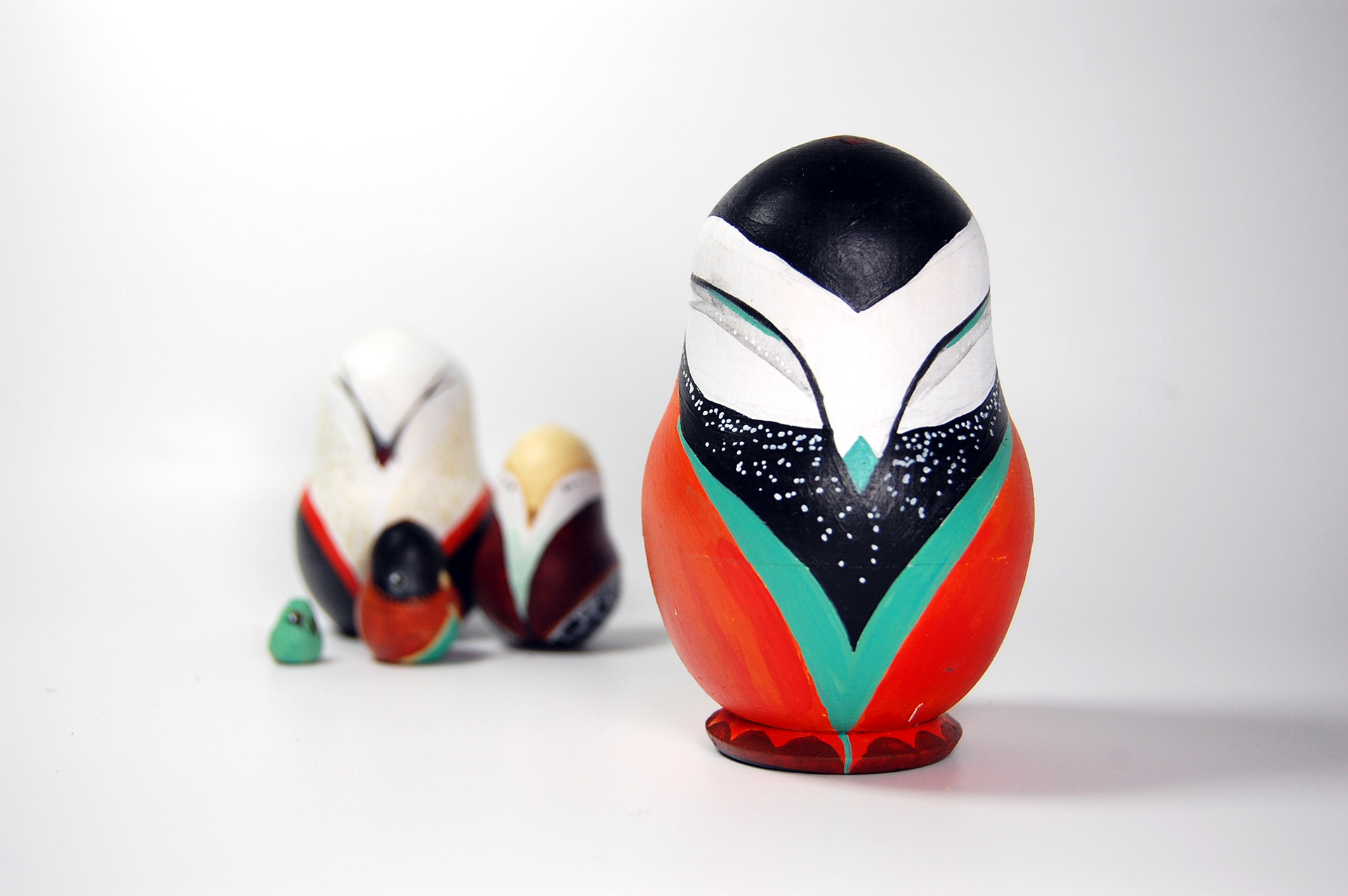 A personal set of Russian Owls with orange, mint, and brown colour palette.