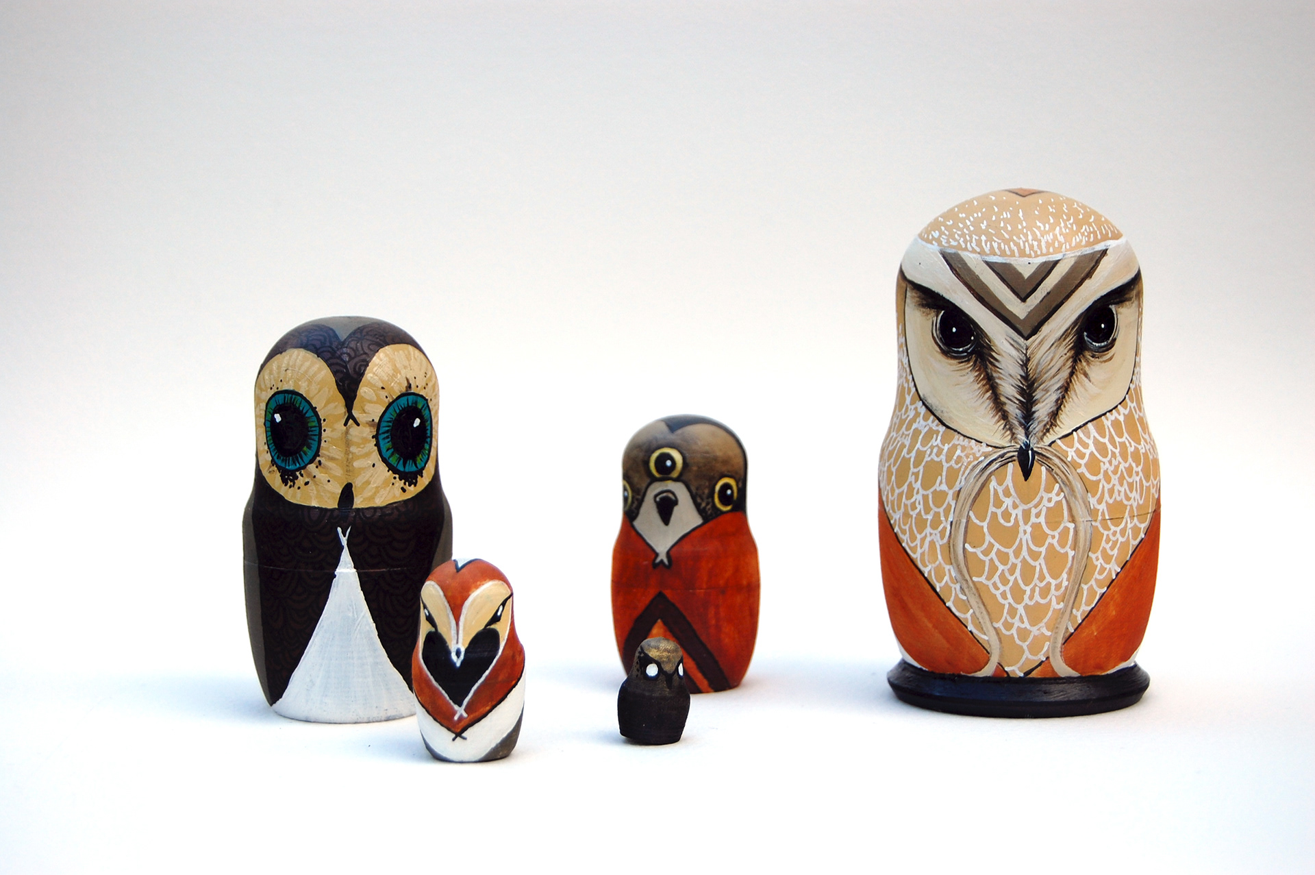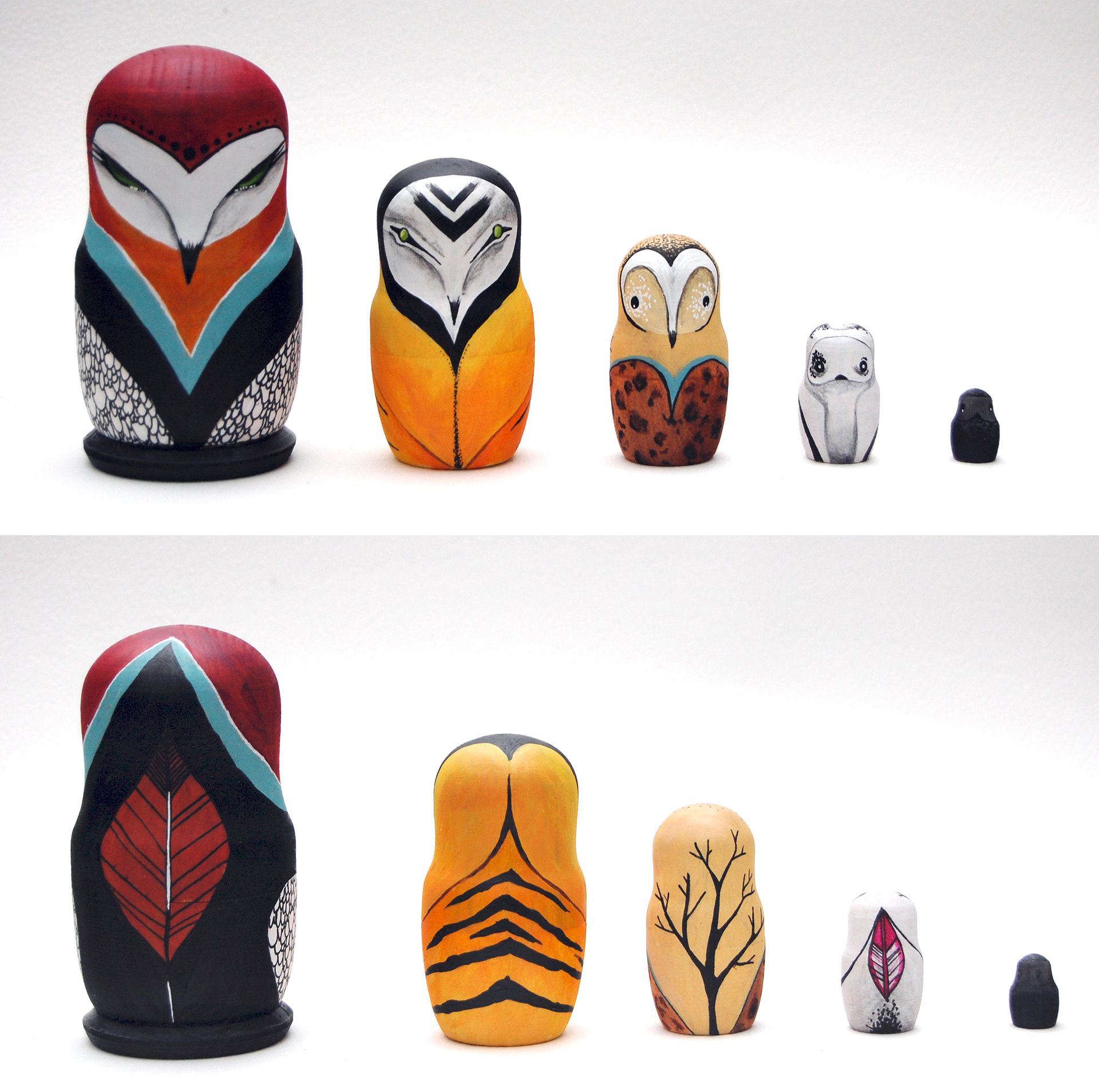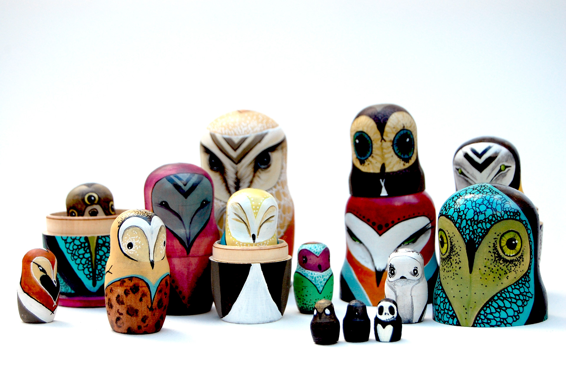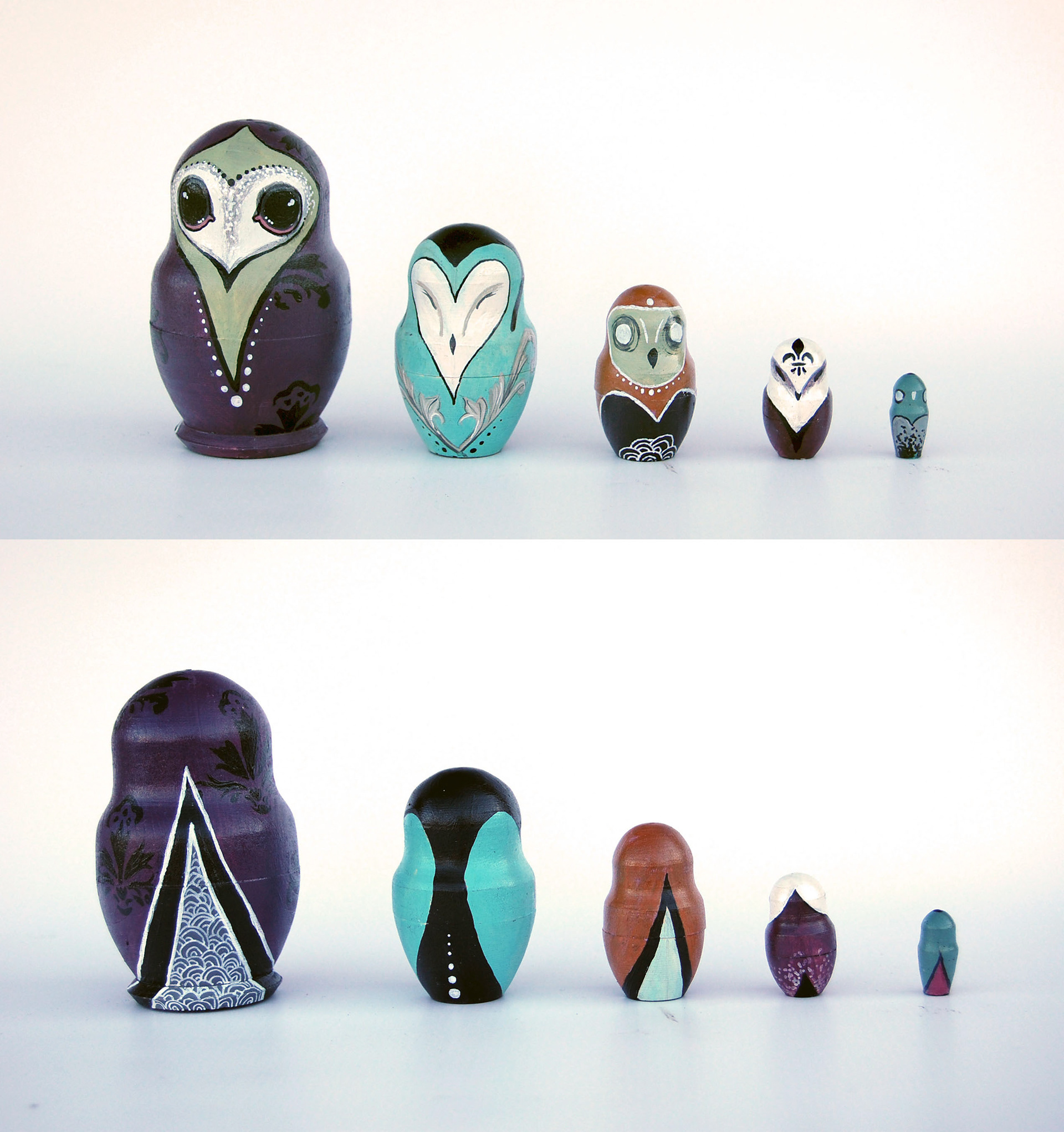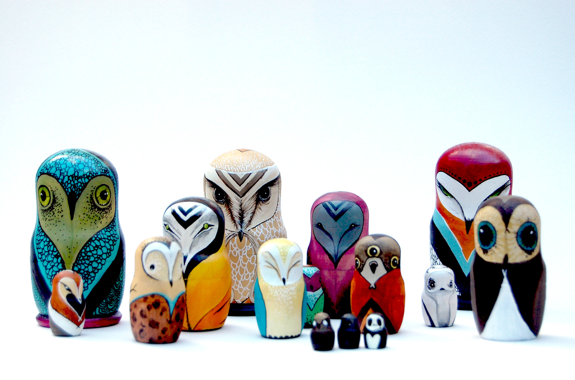 Commissioned Russian Owl Sets. All personalised with specific details (colours, features, or theme).