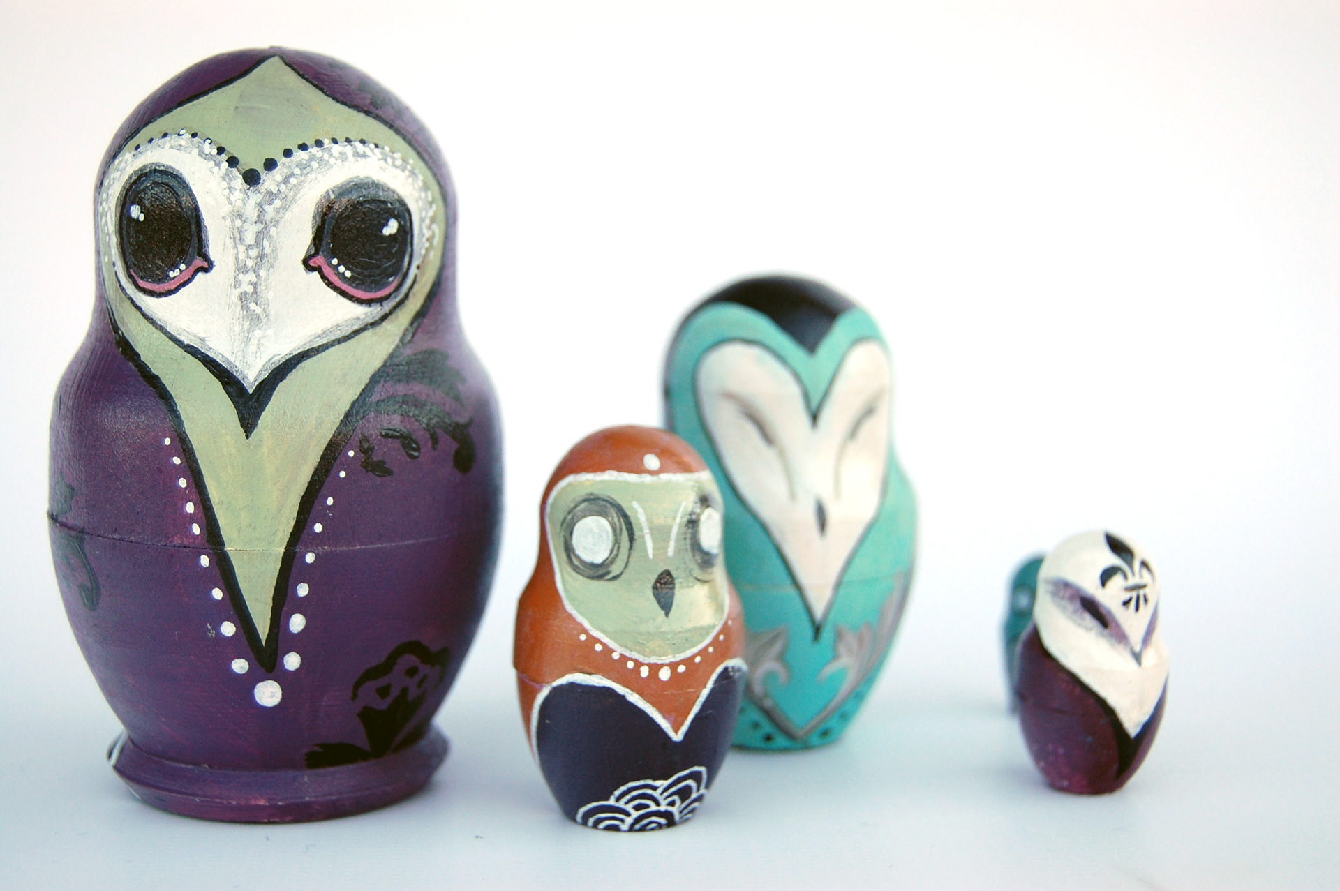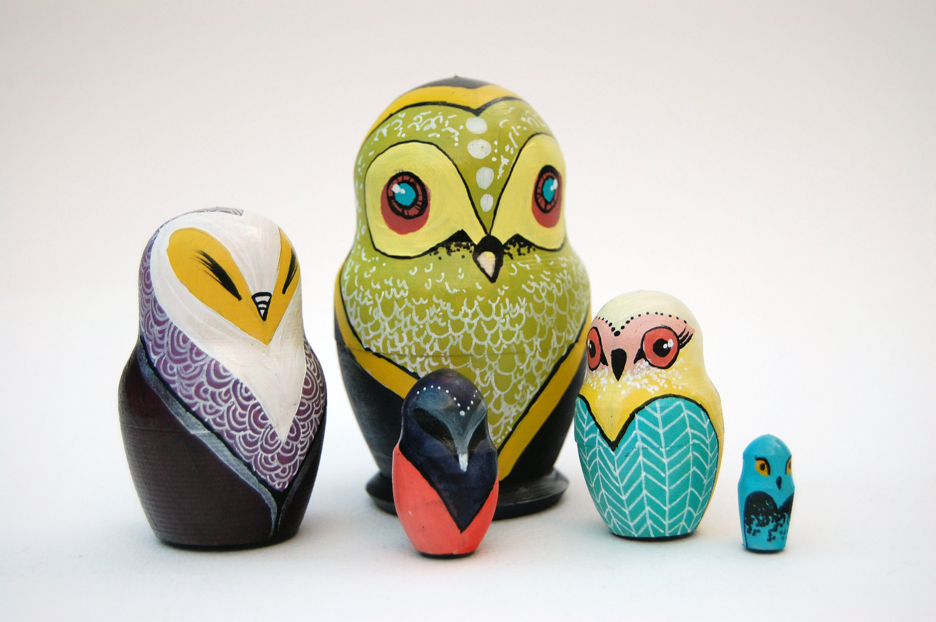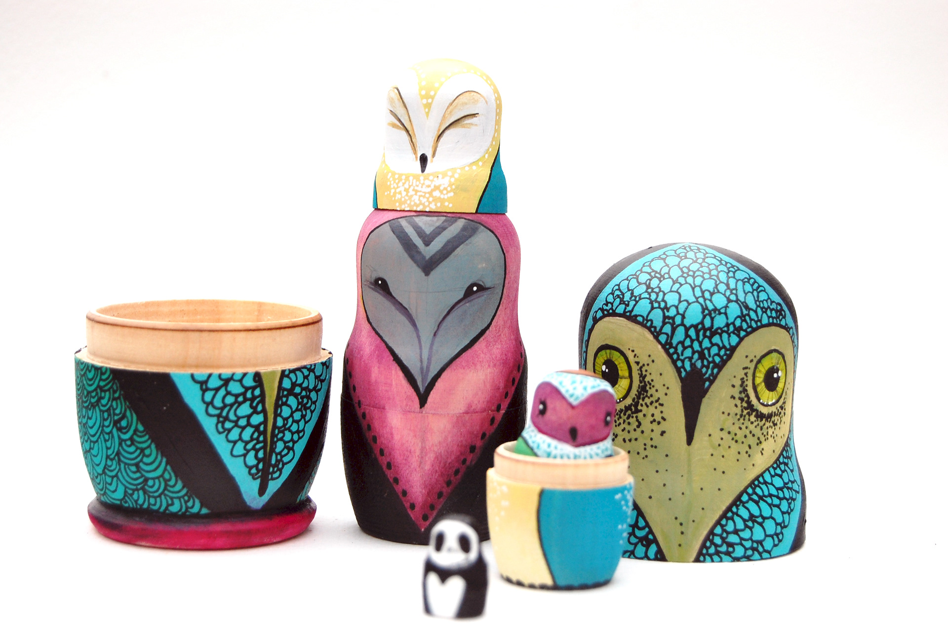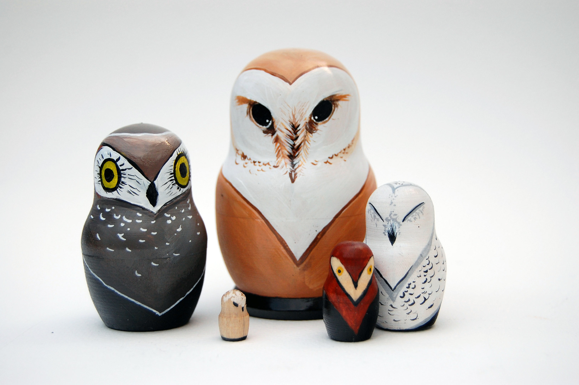 Commissioned Russian Owl Sets. All personalised with specific details (colours, features, or theme).
