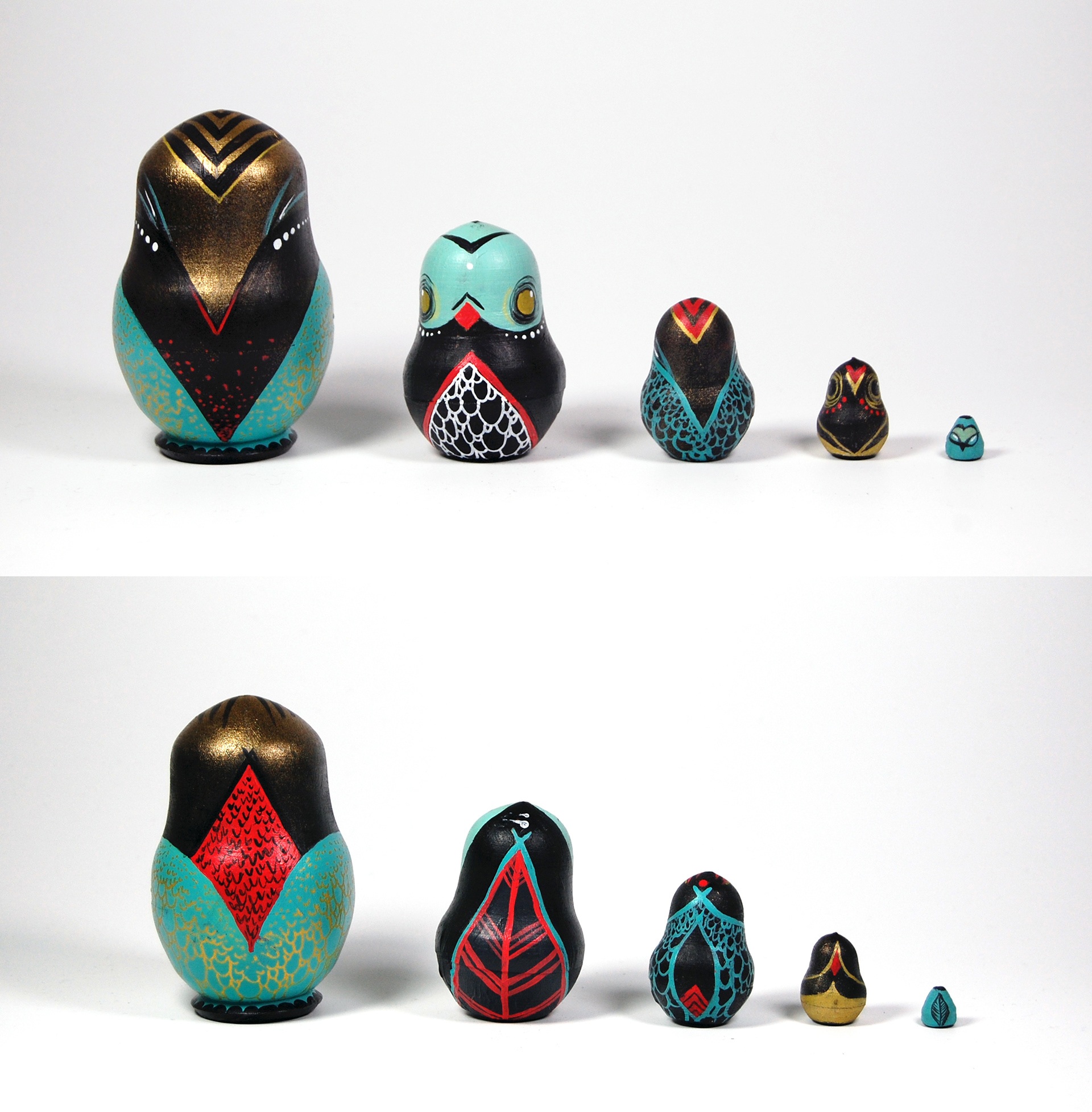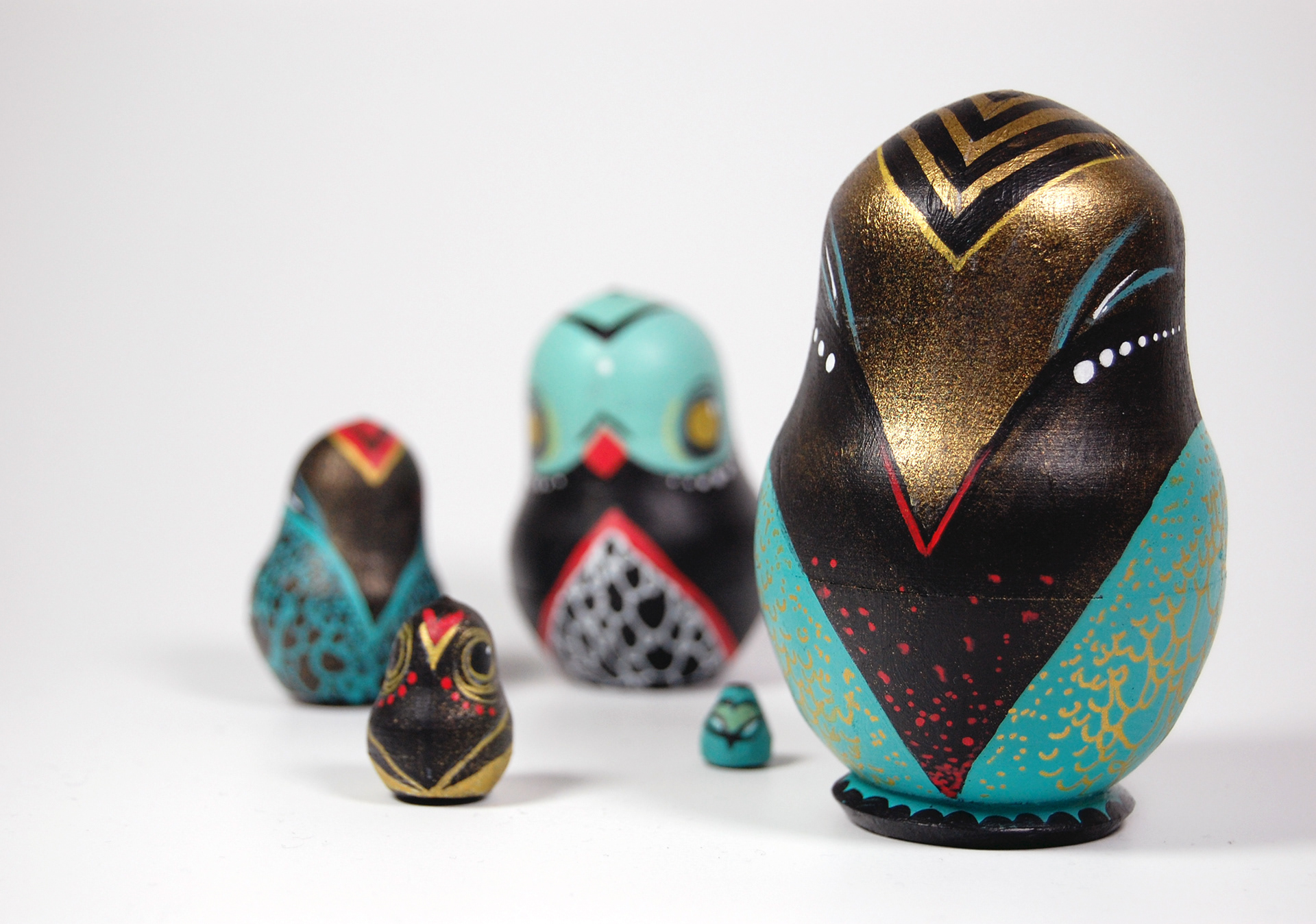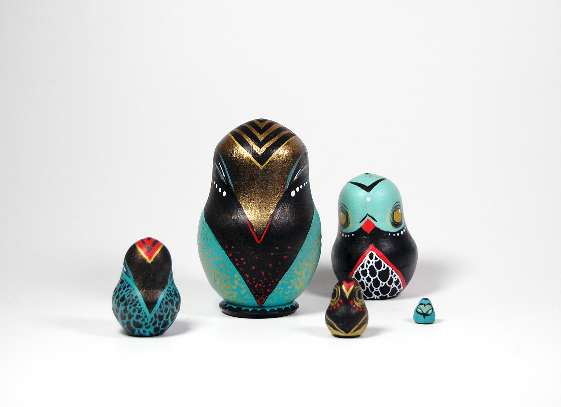 A personal set of Russian Owls in turquoise and gold.